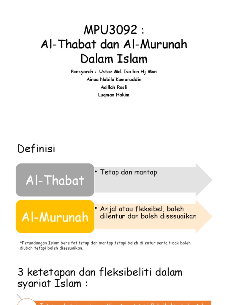 MOHAMAD ZULHISYAM BIN MAHMAD ZAINI. View Al-Thabat Wal Murunah Amalan Syariat Qatie Sesuai Masa Tempatpptx from PENDIDIKAN ISLAM at IPG Kampus Bahasa Melayu. Tujuannya agar tidak mengakibatkan pembentukan syariat berdasarkan nafsu dan kepentingan terselubung.